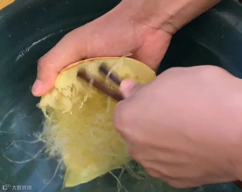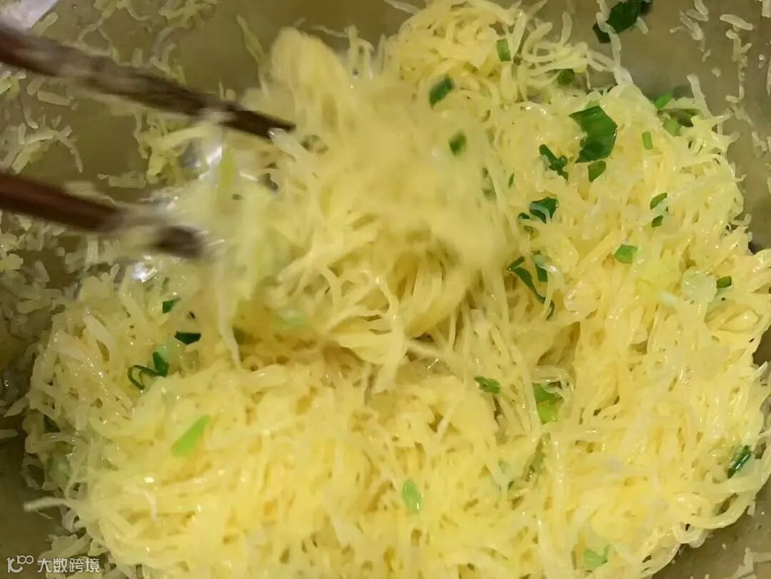 用筷子顺着纹路刮搅出瓜丝,再用凉开水冲洗两遍,沥干水分。