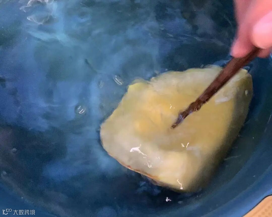 保持大火,适时翻滚金瓜,当可以被筷子插透时,立即关火捞出金瓜放入冷水中。