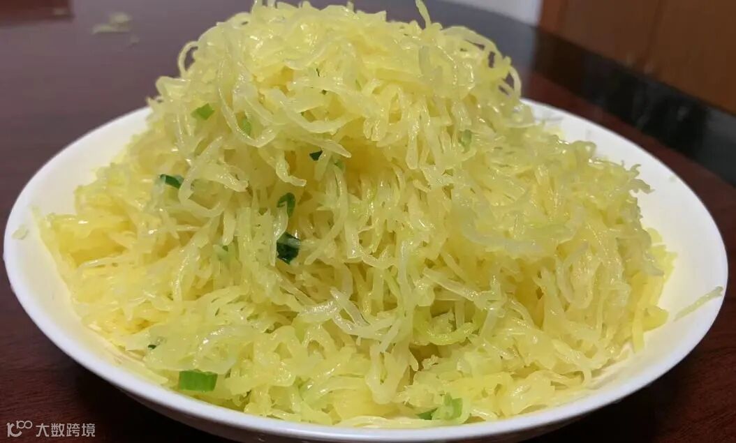 金瓜丝摆盘,加入糖、盐等调料,撒上少许葱花,倒入热油,搅拌均匀即可食用。
