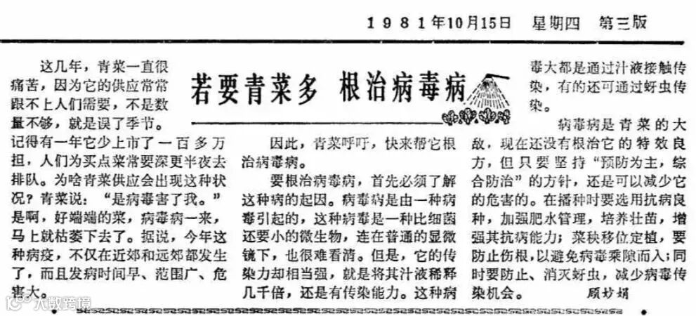 1981年10月15日的《解放日报》报道称,“记得有一年它少上市了一百多万担,人们为买点菜常要深更半夜去排队。为啥青菜供应会出现这种状况?青菜说:‘是病毒害了我。’”