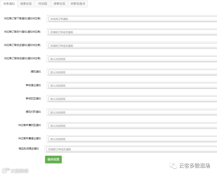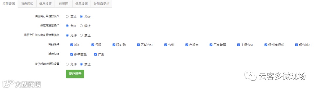 设置供应商插件开启,商品到点通知,申请列表,供应商商品聚合页,提现申请设置,提现方式设置,提现手续费计算方式等。