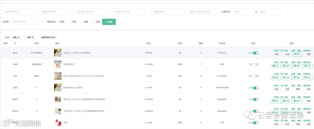 可查看管理供应商的商品价格,库存,销量,供应商,上架状态,编辑产品,推荐产品。