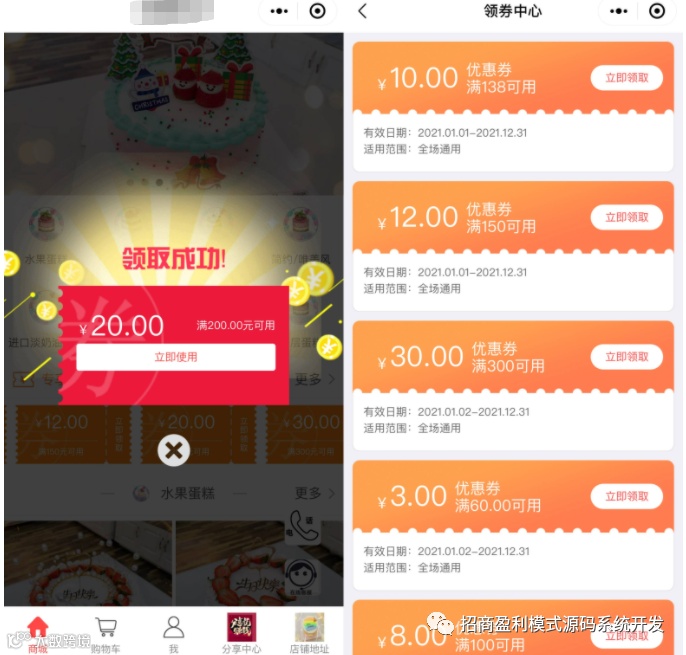 代金券:进入小程序店铺,用户可以随机领取不同额度的优惠券,一人限领2次