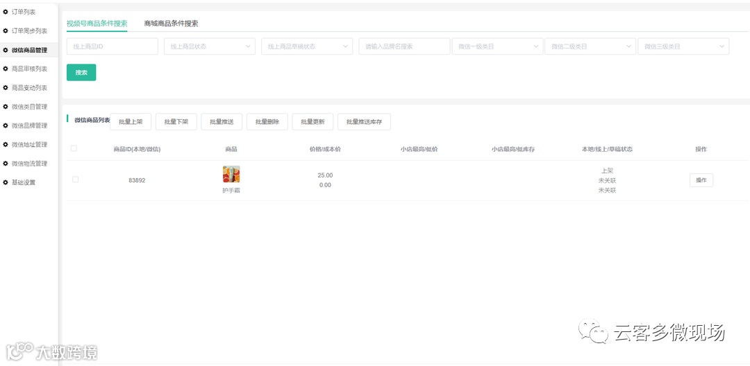 商品统一管理:企业通过视频号小店功能,可将商城商品推送至视频号小店,支持平台自营、供应链、供应商、聚合供应链商品,实现视频号和私域商城一盘货经营。
