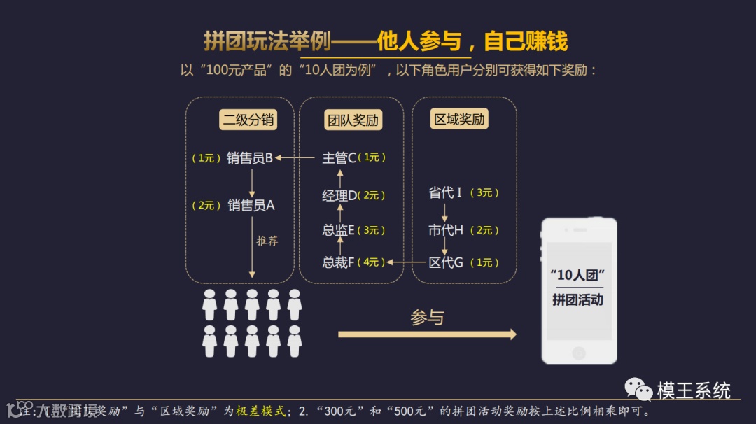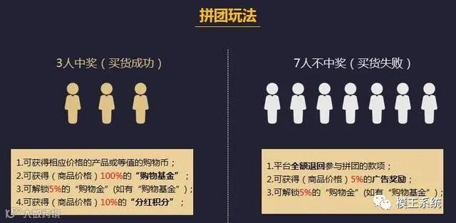 用户可在平台自由选择100、300元、500元等产品价格的拼团活动,满10人后即开团,3人中奖(买货成功),7人不中奖(买货失败)——“无论成败,皆有所获”