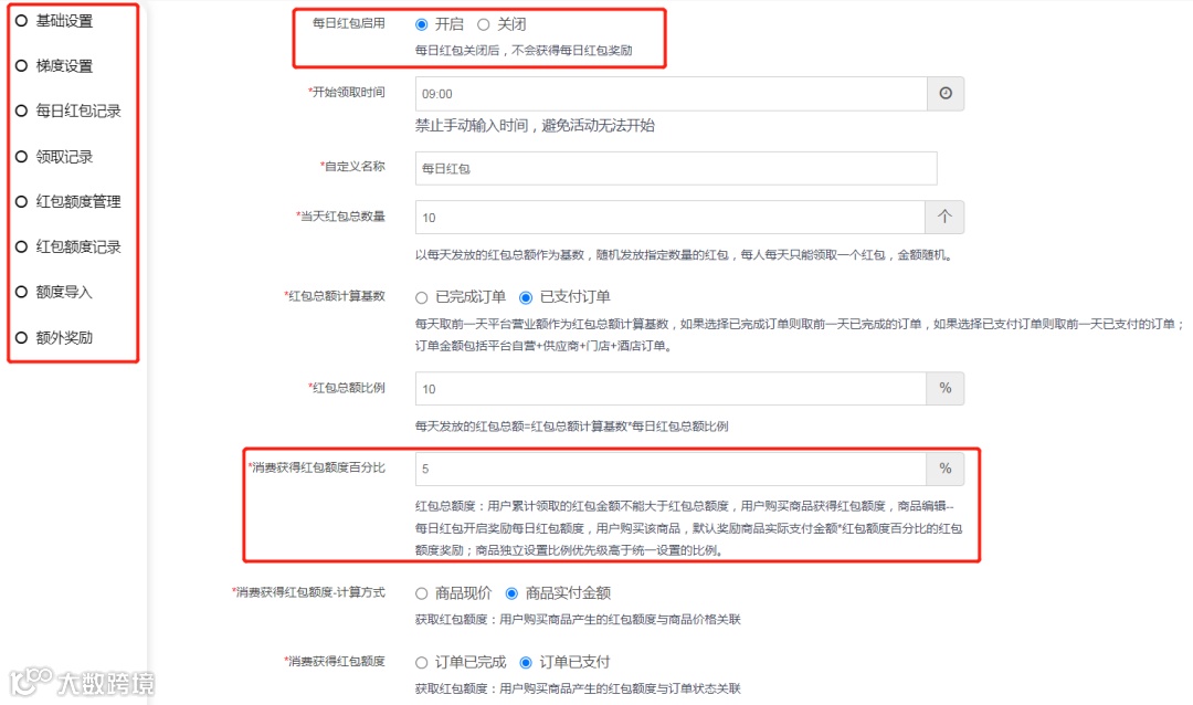 每天取前一天业绩(可以指定已完成或者已支付)的百分比放入红包池。每天红包池总额随机分为N个红包,每个用户可以领取一个,用户领取的红包总金额不能大于所拥有的红包额度。同时,用户可以通过复购获得新的红包额度,继续参与每日红包活动。