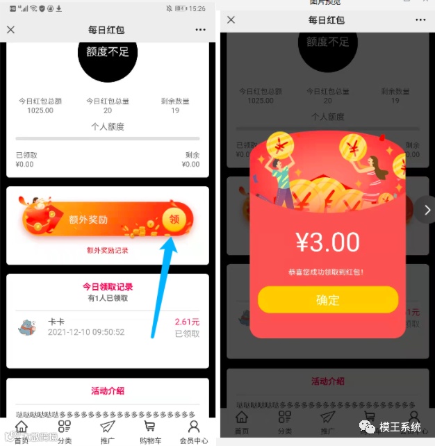 它是根据用户前一天的购物金额而设定的红包额度,平台会根据前一天的总营业额的一定比例作为奖金池,消费过的用户第二天可以去商城领取随机金额的红包。
