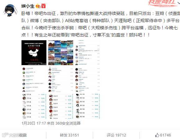 昨晚的“帝吧出征FB”,可以称得上是能载入史册的事件。自一段时间前的香港爱国人士陈净心和台湾爱国人士黄安接连举报支GD、TD艺人起,周子瑜,黄安,林更新,罗志祥,谢霆锋,何韵诗等人也都因两岸三地的关系看法在FaceBook上挑起了网民们的火花。而台湾大选民进党的蔡英文当选更是将事件推向了高潮,表情包什么的火了,黄子韬也火了。