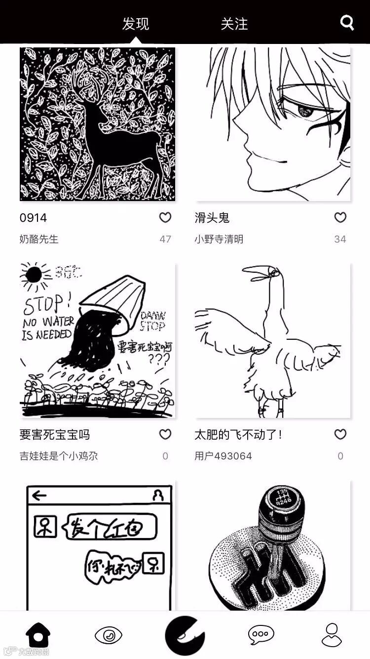 涂手是一个让人惊艳的小众APP,打开应用,你会发现处处都充满惊喜,到处都是让人觉得创造力十足的涂鸦,整个应用内都是黑白配,充满了涂鸦的元素。在里面你不光能够关注喜欢的涂鸦,也能关注到作者已发布的涂鸦;除此之外更赞的地方就是在应用里面可以重播用户创作的过程。用户可以在应用内随意创作涂鸦,也可以根据活动主题完成自己的涂鸦。虽然不知道这个应用怎么赚钱,但是我很喜欢它的艺术气息。抓住核心用户,再慢慢想商业模式吧,强烈推荐!!!!