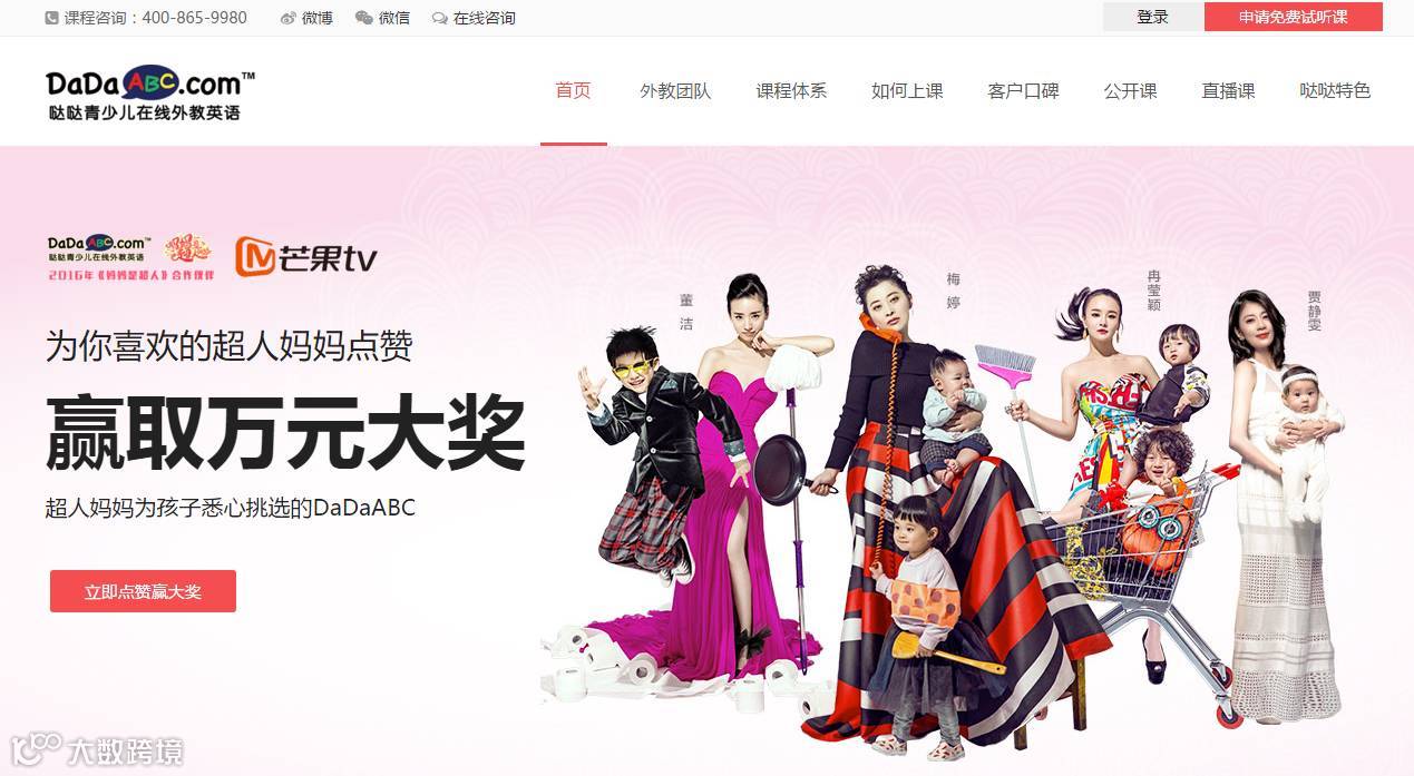 DaDaABC(哒哒在线少儿英语)是一家青少儿外教英语教育网站,为5-13岁小朋友在家通过互联网与中教或外教一对一学习英语,自主研发在线网络视频教室,师生双向视频,产品包括一对多视频上课、一对一视频上课、一对N直播教室、公开课。