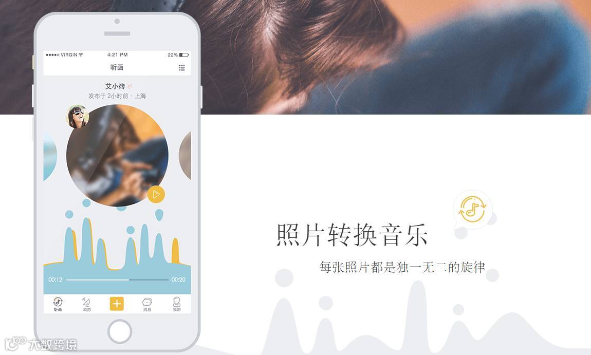 听画APP是一家将图片+音乐融合到一起的移动社交应用,根据每张照片的不同色彩,运用国内首例人工智能技术为你谱出专属于你的独一无二的旋律,上海班砖网络科技有限公司旗下产品。