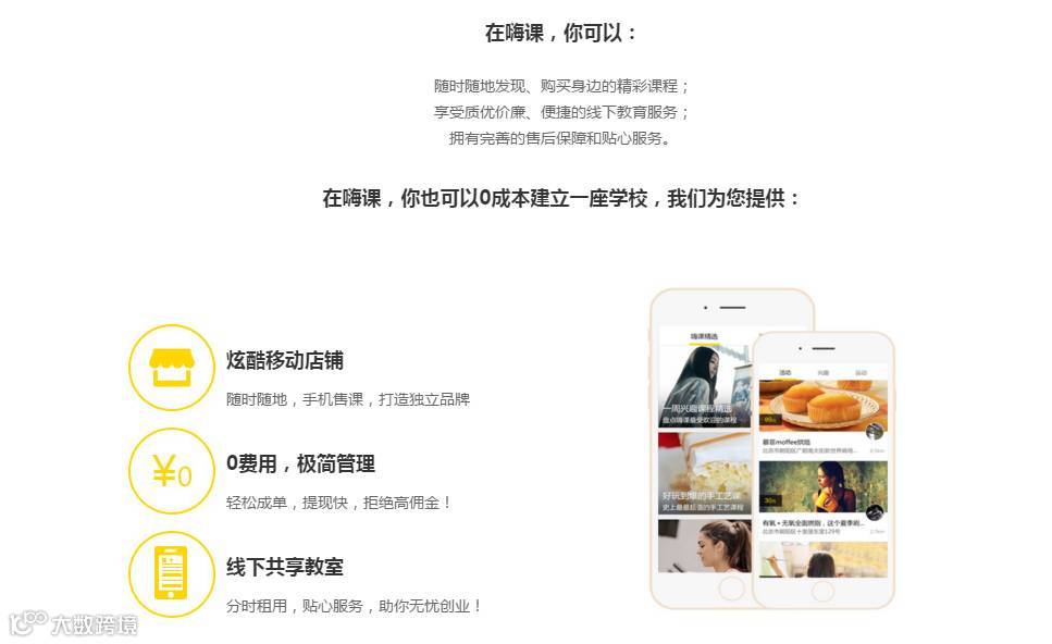 嗨课是一个本地课程与活动的发布与交易平台,商家可以在上面发布课程预约,消费者可以通过地理位置等标签筛选购买附近的兴趣课程和活动。