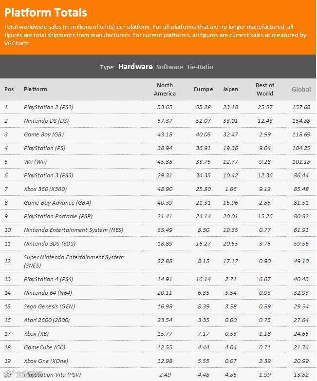 主机市场是一个很明显的二八定律分布——全世界20%(一般还不到)的游戏人口,贡献了80%(一般还要多)的收入,这个跟现在网游很相像。vgchartz这个针对主机的统计网站上,统计口径都是北美(不包括墨西哥以下)、欧洲(不包括东欧)、日本和“Rest of World”。对比起来Rest of World的销量数据真的是微不足道的。