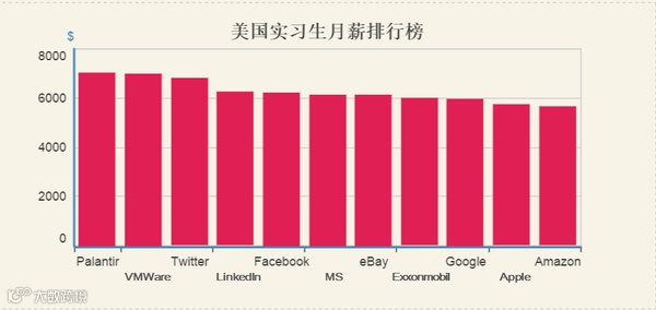 而对于硅谷的各大牛人来说,Palantir也是趋之若鹜的地方。在员工待遇方面,Palantir也是首屈一指。根据美国的薪酬平台Glassdoor在2014年的数据,在实习生月薪排行榜上,Palantir高居第一,达到7012美元(具体数据及图表原型请点击)。