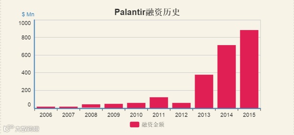 混到这个地步,即使亏损或者不IPO,也不会差钱了。Palantir早已成为投资圈追逐的明星企业。关于Palantir历年的融资情况见下图(具体数据及图表原型请点击),总共经历了十几轮融资,从A轮已经快到Z轮了。最早的投资来自于CIA旗下的In-Q-Tel风投基金和Thiel的Founders Fund。而最近一次融资发生在2015年底,共计8.84亿美元,投资基金包括In-Q-Tel、Founders Fund和老虎基金。估值超过200亿美元,成为仅次于Uber和Airbnb的第三大独角兽。