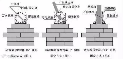 1、确定围栏撑杆的具体位置:在围墙顶部用冲击钻打孔,用M10×100(中间杆可用M8×80)强力膨胀螺栓将撑杆固定在合适的位置。