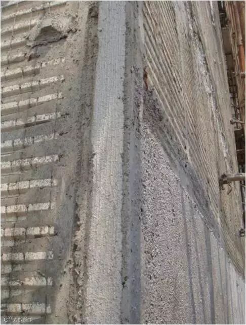 施工缝处理:墙、柱水平施工缝在墙、柱边线内再弹一道切割线,用无齿锯切割,切割深度3cm。柱、墙上顶水平施工缝按标高线往上5mm再弹一道切割线,进行切割。下图为框架柱柱头和柱根部处理
