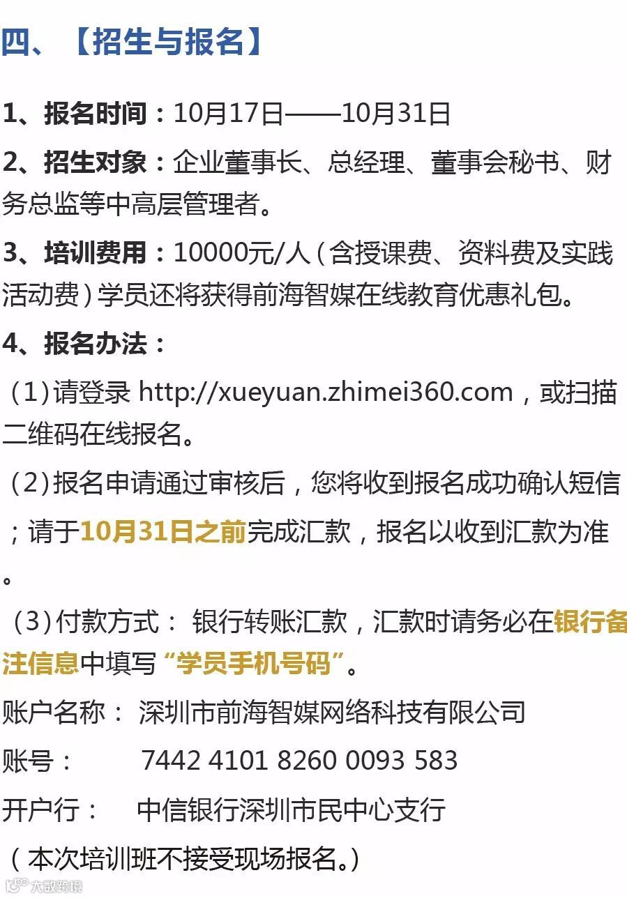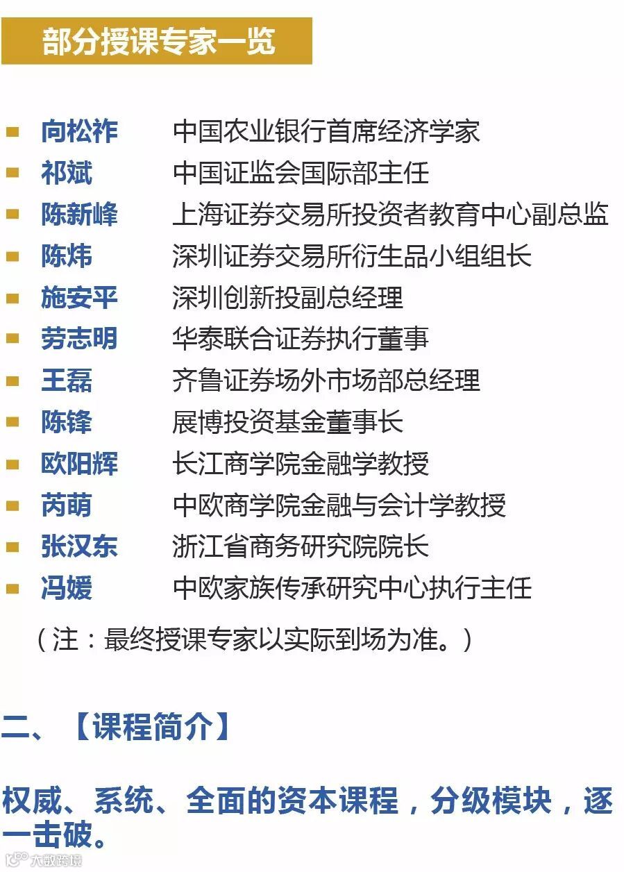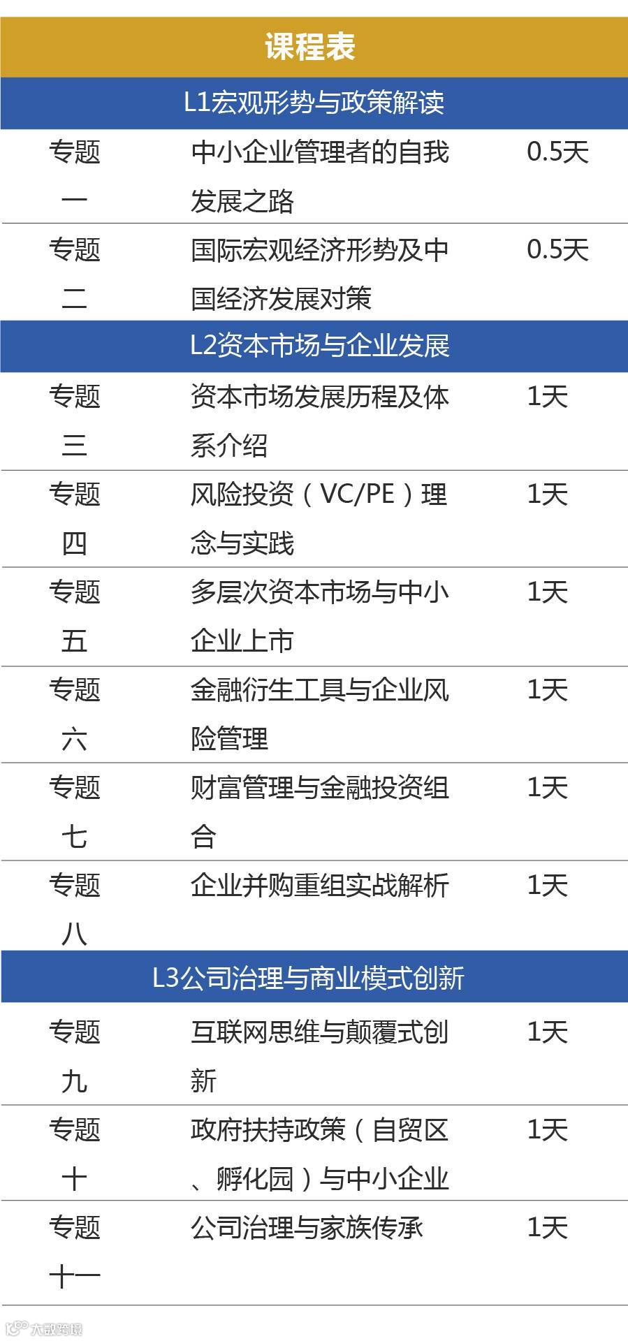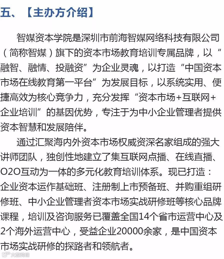 本次课程对于想学习资本的企业家非常难得,智媒倾心吐血之作,类公益项目,3月10天课程,商学院收费20万,我们仅收1万元场地费用。课程讲师是由深交所、上交所领衔,均为国内金融届在职大佬。内容涵盖资本市场、风投、金融衍生工具、资产证券化、并购重组、财富管理、家族传承。三个月系统的封闭式培训,让企业家能够全面认识资本市场,掌握资本运营工具。
