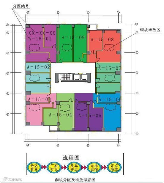 2.楼层制作分区图,根据建筑设计平面图,按照房间边线,60~100m范围内划为一个区并编号,并在每个分区内指定砌体堆放范围,分区编号采用XX-XX-XX,表示楼号-层号一分区号,例如A-15-01,表示A楼15层01区,引导现场砌块搬运一次到位,减少周转次数。