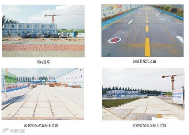 2. 办公区域必要的临时道路宜采用花纹砖铺设, 可重周转利用。施丁区域临时道路宜采用装配式钢板道路、混凝土道路。