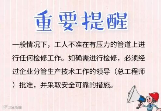 在检修作业中,工人未经允许在带压力的管道上进行焊接、紧螺丝等操作,易引发管道爆裂,导致伤亡事故。