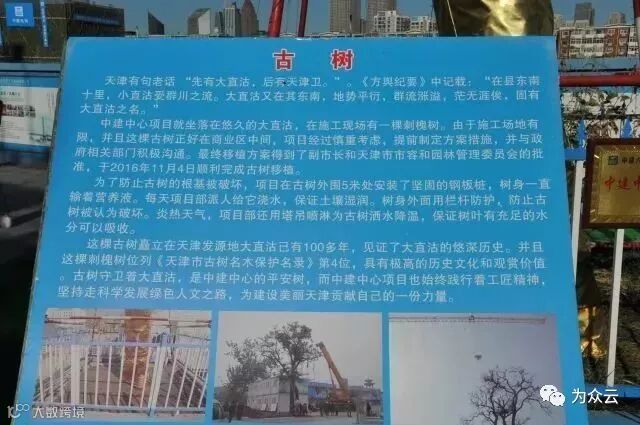 项目施工现场有一棵百年刺槐树,由于施工场地有限,必须对古树进行移植。项目部提前制定方案措施,并与政府相关部门积极沟通,于2016年11月4日顺利完成古树移植。为了防止古树的根基被破坏,项目在古树外围5米处安装了坚固的钢板桩和栏杆防护,并配备营养液。刺槐树位列《天津市古树名木保护名录》第4位,具有极高的历史文化和观赏价值。项目部践行着工匠精神,坚持绿色人文,为建设美丽天津贡献自己的力量。