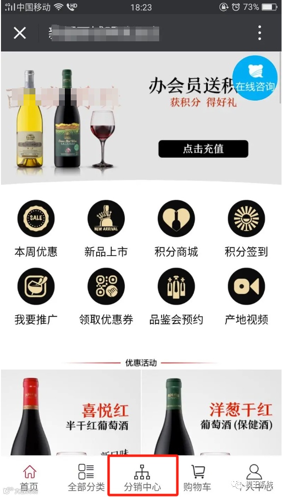 二级分销做法:他们分销的产品主要是红酒和菜品。用户可以在小程序分销商城的分销中心生成个人或店铺的小程序二维码推广海报,其他用户扫码消费后就和他们建立了分销关系,他们能够永久地从这些消费中获取分成。