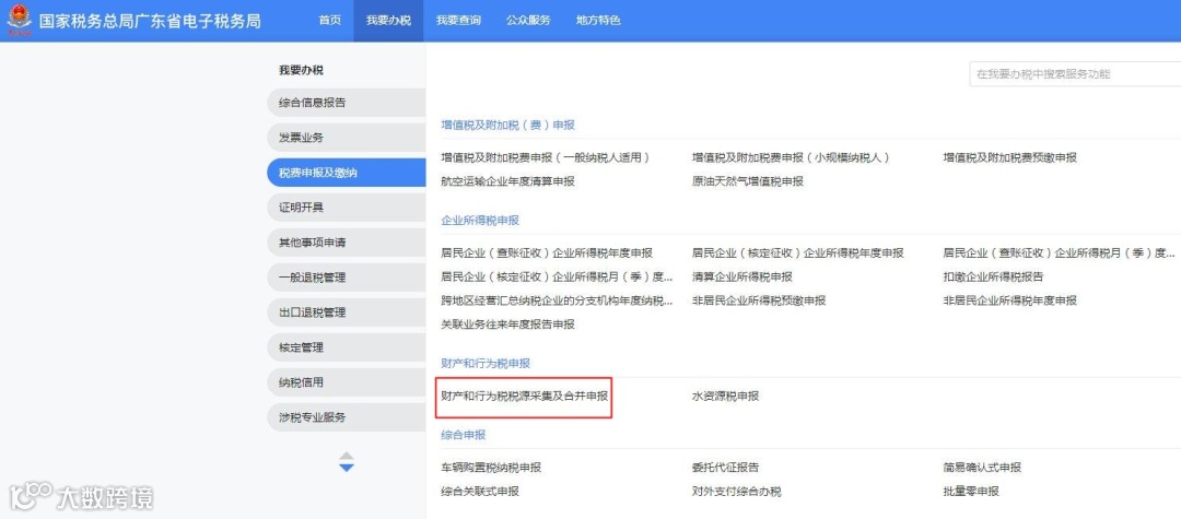 登录电子税局后,点击【我要办税】-【税费申报及缴纳】-【财产和行为税申报】-【财产和行为税税源采集及合并申报】功能菜单。