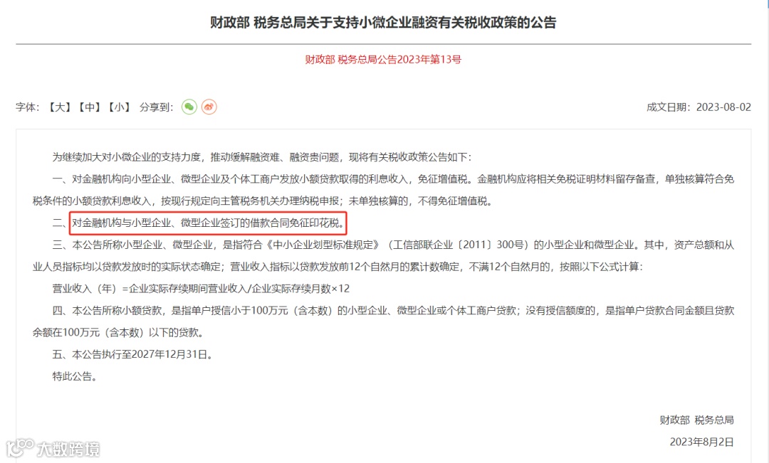 因此,至2027年12月31日,小型企业、微型企业签订的借款合同免征印花税,与金融机构的签订的借款合同也免征印花税。