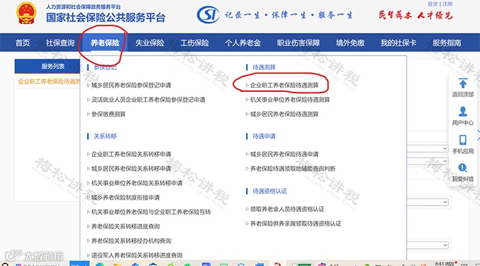 第一步:登录“国家社会保险公共服务平台”,找到“养老保险-企业职工养老保险待遇测算”。