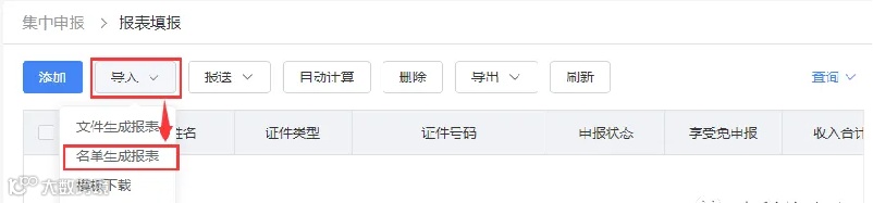 3、选择导入-名单生成报表,在新增导入中点击“选择文件”,将自然人电子税务局(扣缴端)中导出的集中申报自动计算名单表的excel导入。