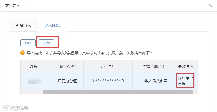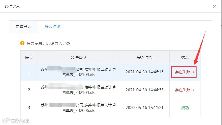 4、点击导入结果,可查看到导入记录,点击状态下的“存在失败”,可查看到失败的人员,移动到最右侧,可查看失败原因,系统同时支持复制失败人员的信息。