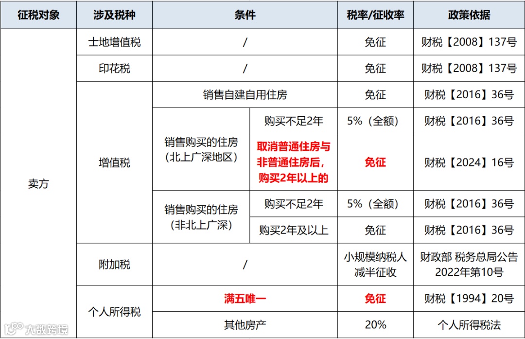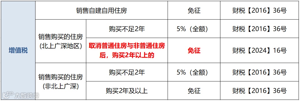 2、北京市、上海市、广州市和深圳市,凡取消普通住宅和非普通住宅标准的,取消普通住宅和非普通住宅标准后,与全国其他地区适用统一的个人销售住房增值税政策,对该城市个人将购买2年以上(含2年)的住房对外销售的,免征增值税。