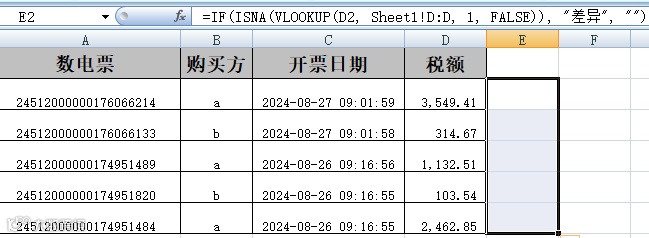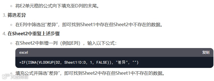 然后直接粘贴公式到相应的表格栏次,直接填充,就找出差异了。