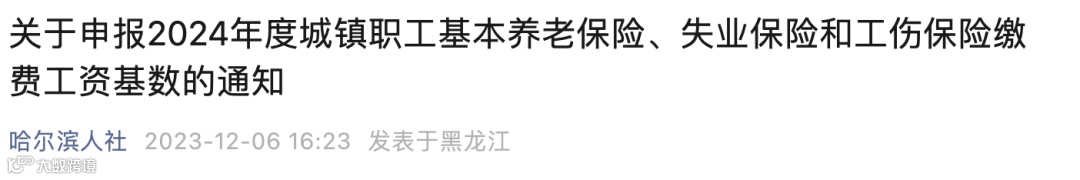 近期,哈尔滨人社部门发布了《关于申报2024年度城镇职工基本养老保险、失业保险和工伤保险缴费工资基数的通知》,明确哈尔滨市各参保单位自2024年1月起启用新的缴费基数。
