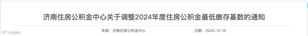 12月18日,山东济南住房公积金管理中心发布了《济南住房公积金中心关于调整2024年度住房公积金最低缴存基数的通知》。