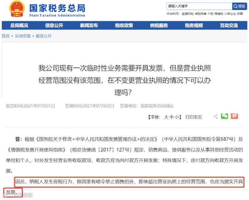 另外按照规定,如果纳税人发生应税行为,除国家有明令禁止销售的外,即使超出营业执照上的经营范围,也应当据实开具发票。