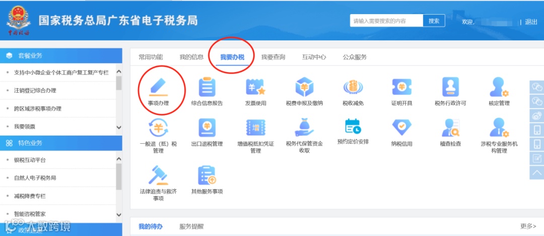 1.在国家税务总局广东省电子税务局,选择【我要办税】→点击【事项办理】。