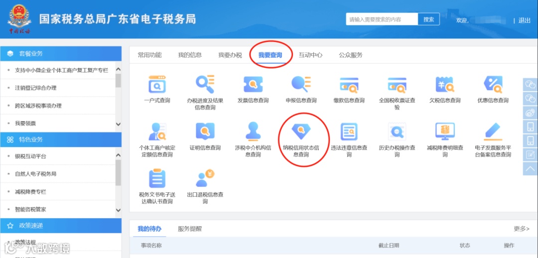 1.在国家税务总局广东省电子税务局,选择【我要查询】→点击【纳税信用状态信息查询】。
