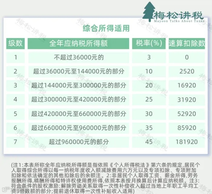 1、居民个人取得全年一次性奖金,符合《国家税务总局关于调整个人取得全年一次性奖金等计算征收个人所得税方法问题的通知》(国税发〔2005〕9号)规定的,不并入当年综合所得,以全年一次性奖金收入除以12个月得到的数额,按照本公告所附按月换算后的综合所得税率表,确定适用税率和速算扣除数,单独计算纳税。