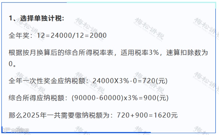 综合来看,小松2025年年终奖选择单独计税会更划算。
