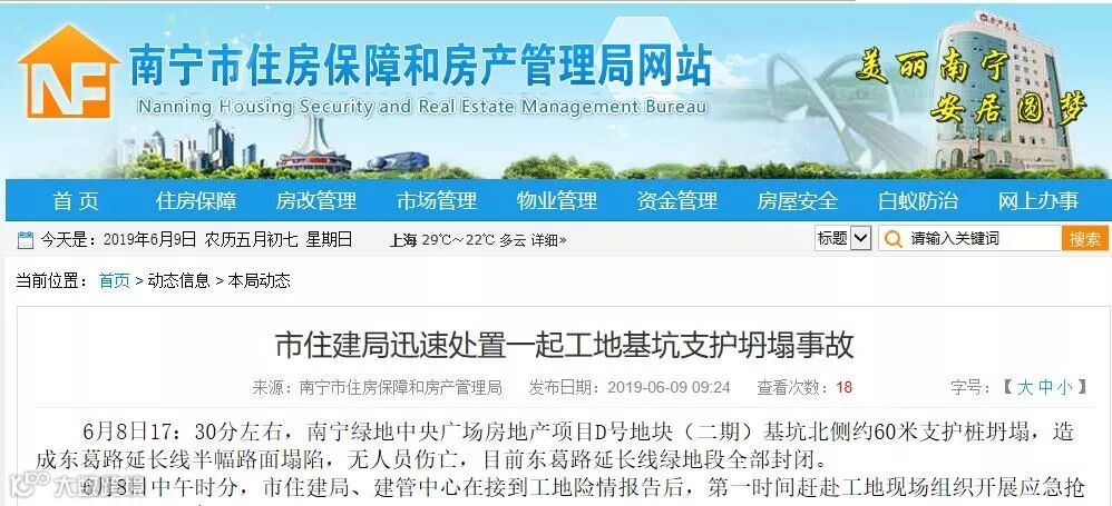 昨天上午,广西南宁市住建局官网发布信息:6月8日,南宁绿地中央广场房地产项目D号地块(二期)基坑北侧约60米支护桩坍塌,造成东葛路延长线半幅路面塌陷,事故未造成人员伤亡。目前,现场正在开展抢险工作。