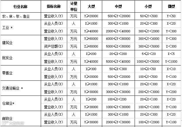 注意:大型、中型和小型企业划定,须同时满足所列指标的下限,否则下划一档;至于最低一档的微型企业,只须满足所列指标中的一项即可(因为有一项降至微型企业标准就意味着不满足所有上档标准,也就不符合上档“必须同时满足该档所列指标的下限”的标准要求)。