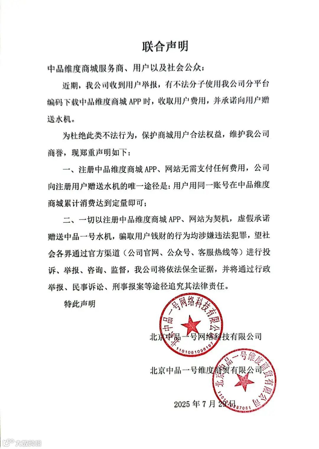 近日,我公司收到用户举报,有不法分子使用我公司分平台编码下载中品维度商城APP时,收取用户费用,并对用户做虚假宣传和虚假承诺。对此,我公司第一