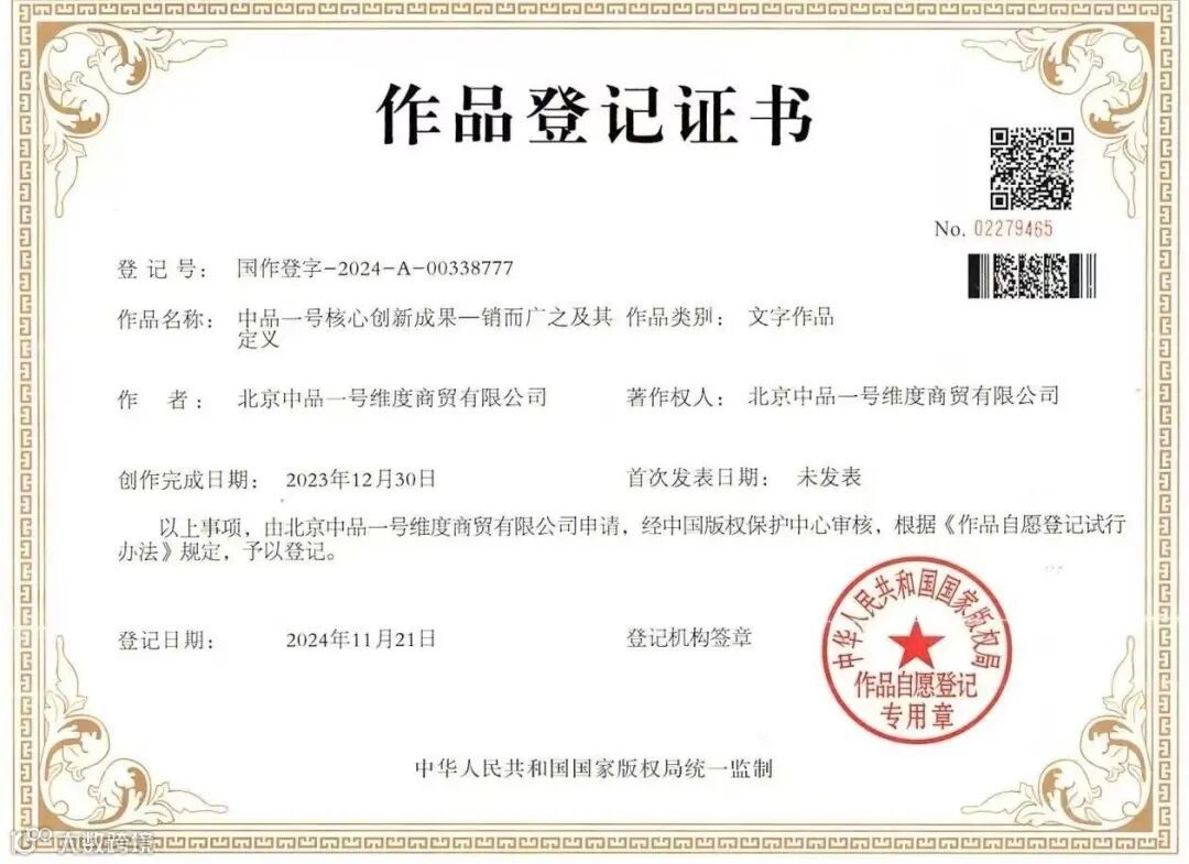 中品一号,正是在消费者面临生存和生活的选择中横空而出,用技术拿回消费者的生活权利,重构新的商业文明,用“相互成就”的商业理念架起去中心化的供需双方直通车,让供需双方深刻认知到彼此是相互依存的命运共同体,中品一号把这一伟大的商业写进发明创造中,并均已获得国家专利和版权保护。这是中品人之福,消费者之福,商业之福!