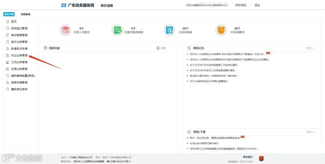 ④登录完成后,关闭所有弹窗,点击左侧失业业务管理;
