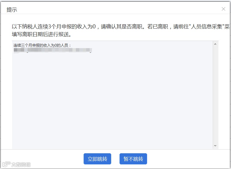 “以下纳税人连续3个月申报的收入为0,请确认其是否离职。若已离职,请前往"人员信息采集”填写离职日期后进行报送。”