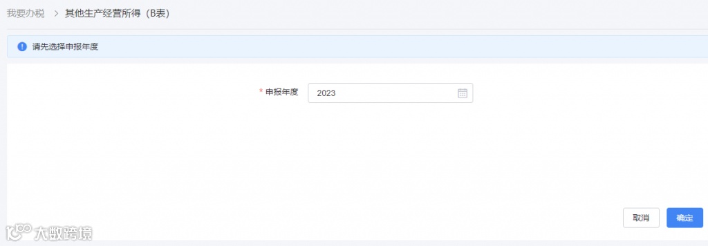 点击进入【其他生产经营所得(B表)】页面,选择【申报年度】,点击【确定】。