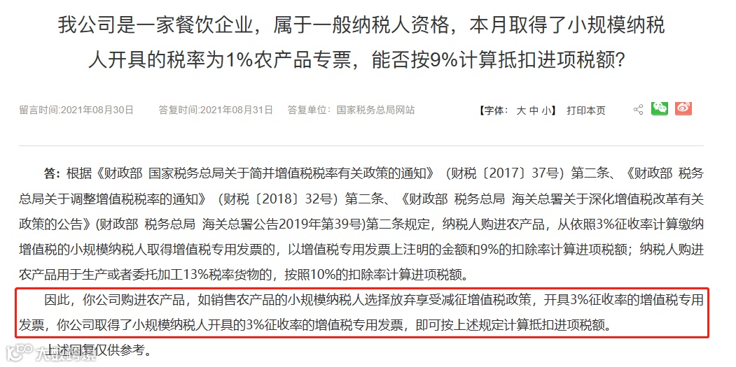 A 公司在购入时,按 9% 计算抵扣进项税,领用进行深加工时(加工 13% 税率的货物),再加计1%进项税额。(即可以按照10%扣除)