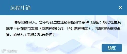 6、确定远程注销时,提示“尊敬的纳税人,您不符合远程注销税控设备条件(原因:***),如需注销税控设备,请联系主管税务机关处理。”,如何处理?